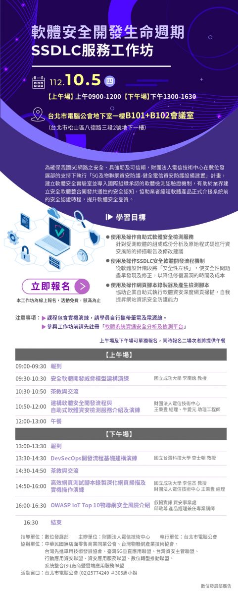 財團法人電信技術中心在數位發展部的支持下,建立軟體安全實驗室,並導入國際組織承認的軟體檢測認驗證機制,有助於業界建立安全軟體整合開發共通性的安全認知,協助業者縮短軟體產品正式介接系統前的安全認證時程,提升軟體安全品質。歡迎各會員公司資訊相關人員報名參加。