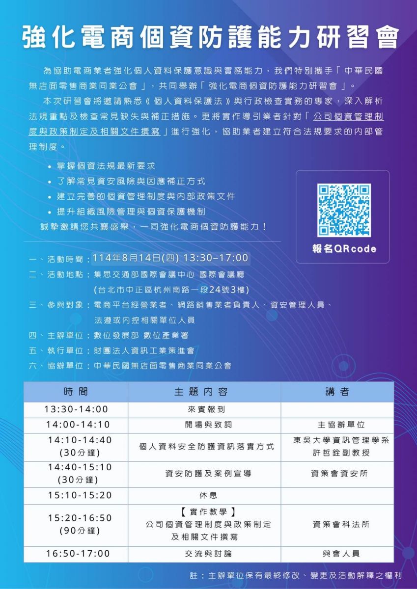 為協助電商業者強化個人資料保護的意識與實務能力,本會特別攜手財團法人資訊工業策進會,舉辦**「強化電商個資防護能力研習會」**。