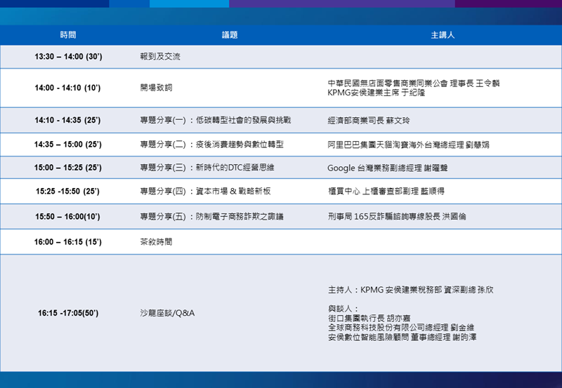 日期:2021年11月24日(三) 時間:13:30-17:00 (13:30-14:00 開放入場) 聯絡資訊:02 8101 6666 ext.20324 / 陳小姐 / carolchen6@kpmg.com.tw |